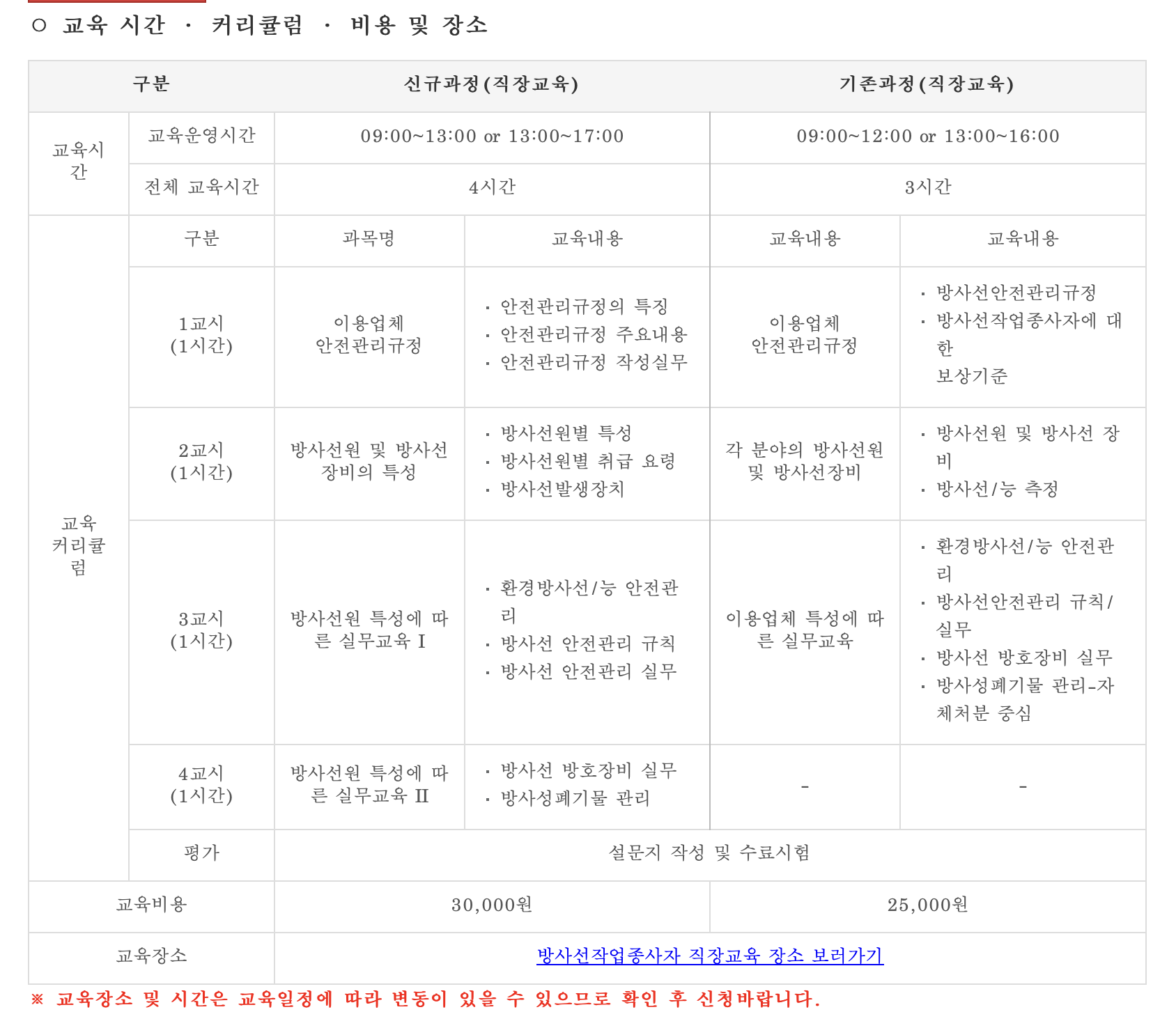 방사선작업종사자 직장교육은 일반분야(산업/의료/교육·연구) 또는 신규종사자를 대상으로 하는 교육입니다.