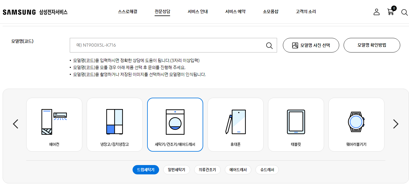 특히 홈페이지나 모바일페이지를 통해서 직접 사용하시는 모델명을 검색하신 뒤 고장증상을 선택해 온라인으로 간단하게 문제해결을 시도해 볼 수 있습니다.