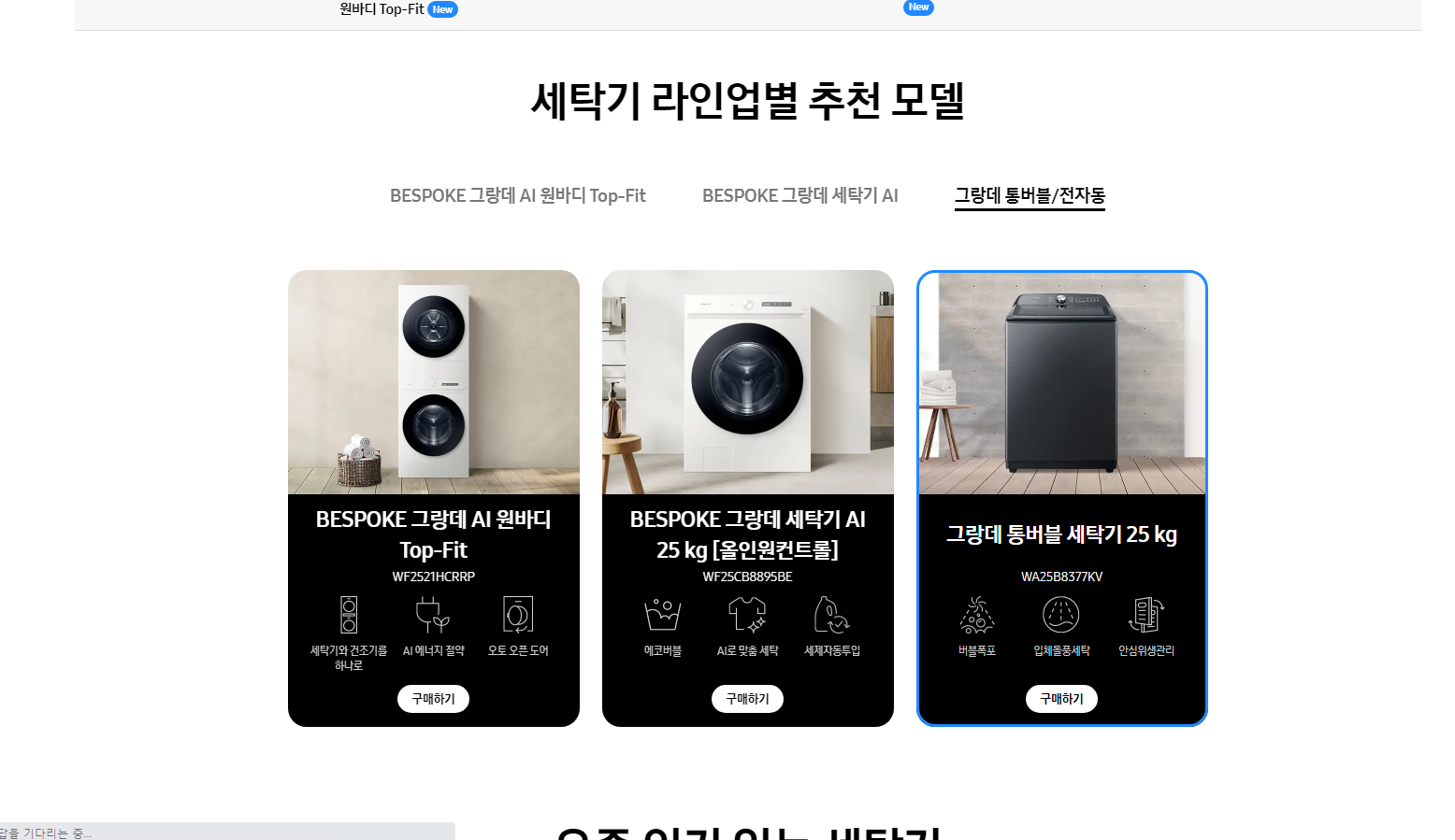 현재는 비스포크, 그랑데 통버블, 브랜드명 없이 삼성만 달고 나오는 세탁기 제품들이 있습니다.