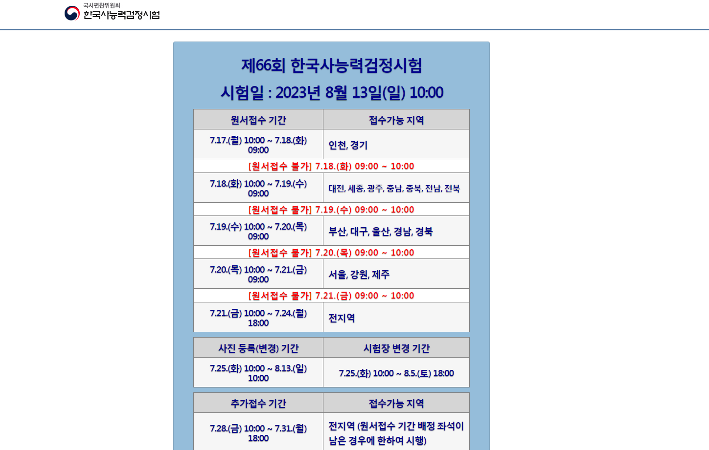 제66회 시험일정안내 2023년 8월 13일(일) 10:00 원서접수 2023년 7월 17일(월) 10:00 ~ 2023년 7월 24일(월) 18:00 접수중 추가접수 2023년 7월 28일(금) 10:00 ~ 2023년 7월 31일(월) 18:00 ※ 추가접수는 원서접수 기