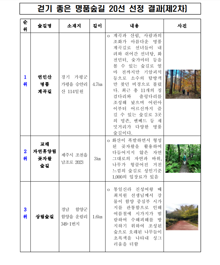 '제2차 걷기 좋은 명품숲길 경진대회' 결과를 붙임과 같이 알려드립니다.