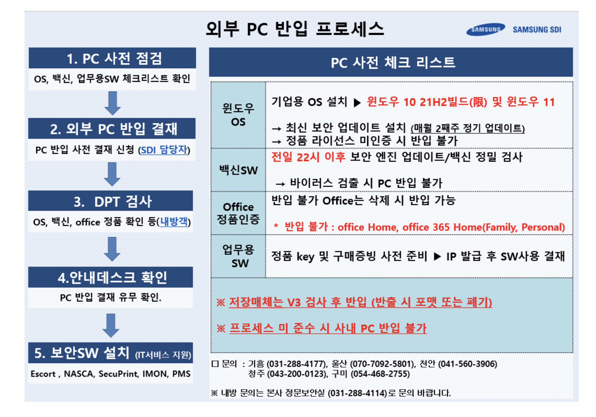 PC사전점검 - 외부 PC 반입 결재 - DPT 검사 - 안내데스크 확인 - 보안 SW 설치 (IT서비스지원)